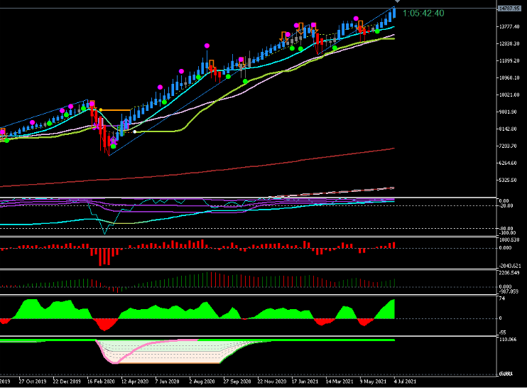 Sie sehen den monatlichen Kerzenchart 2017 - 2021. Die Software zeigt am Anfang des Monats einen Punkt. Dieser zeigt die nächste wahrscheinliche Richtung auf.